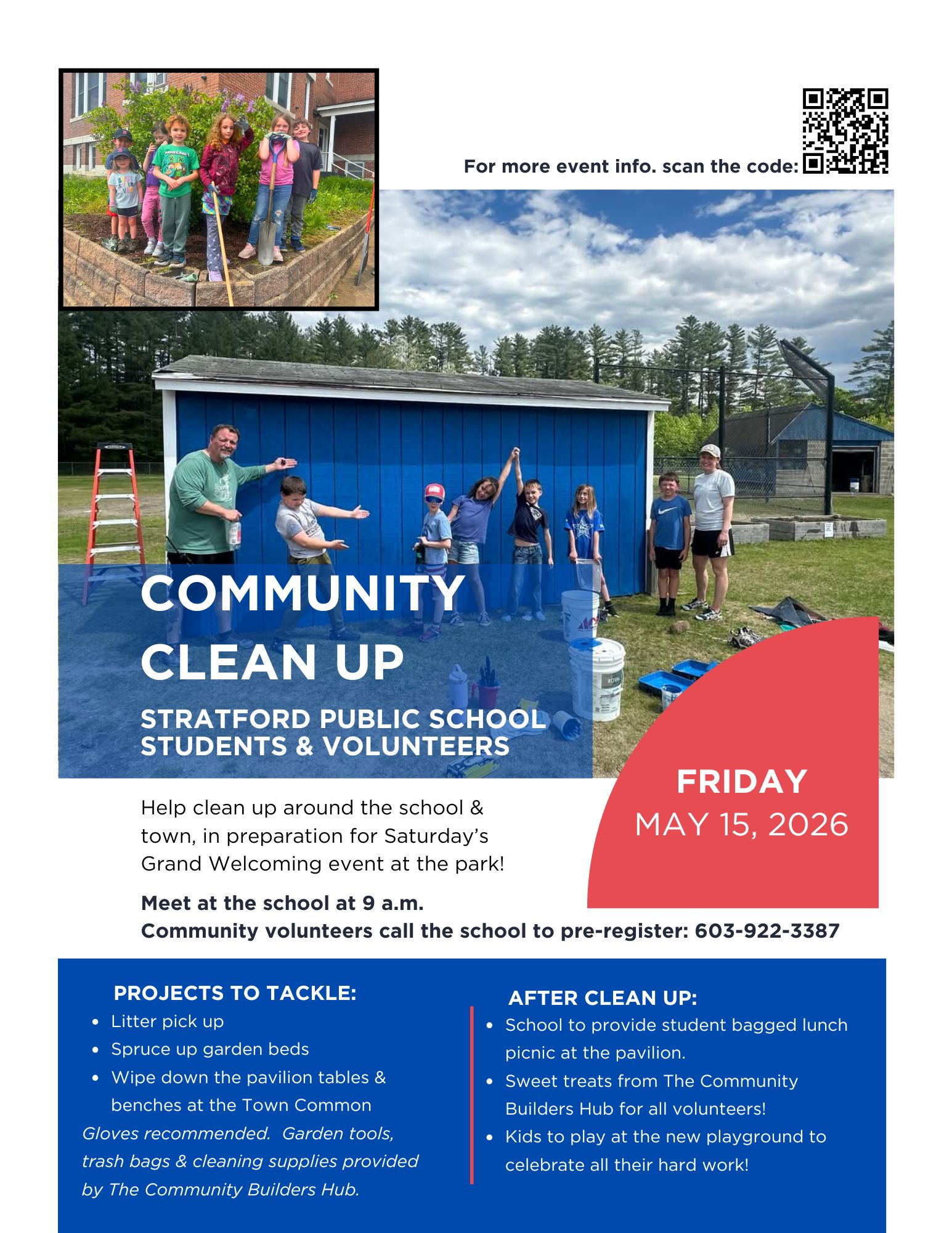 Community members are invited to join Stratford Public School students and staff in a (Stratford) Community Clean Up Day on Friday, May 15th. Volunteer projects include cleaning the pavilion on the town common; litter pick up around the school, common and park; and sprucing up garden beds at the school. Students will enjoy a bagged lunch picnic at the pavilion by the Stratford Public Library and sweet treats from the Community Builders Hub. They’ll get to cap off the day with playing at the new playground at the revitalized Backstreet River Recreational Park, located behind Main Street.